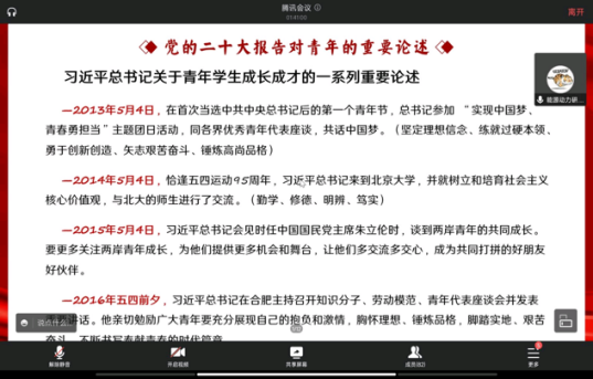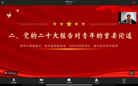 最后,田老师重点提到了党的二十大报告对青年的重要论述:“青年强,则国家强。当代中国青年生逢其时,施展才干的舞台无比广阔,实现梦想的前景无比光明”。告诫我们广大青年应当坚持埋头苦干,真正把脚踩在泥土里,勇做新征程上的实干担当者,在青春的赛道上奋力跑出加速度。