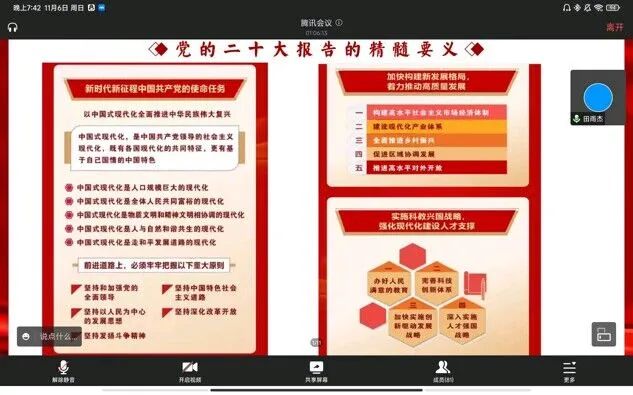 首先,田老师谈到了党的二十大报告的精髓要义。党的二十大报告主题为“高举中国特色社会主义伟大旗帜,全面贯彻新时代中国特色社会主义思想,弘扬伟大建党精神,自信自强、守正创新,踔厉奋发、勇毅前行,为全面建设社会主义现代化国家、全面推进中华民族伟大复兴而团结奋斗”。